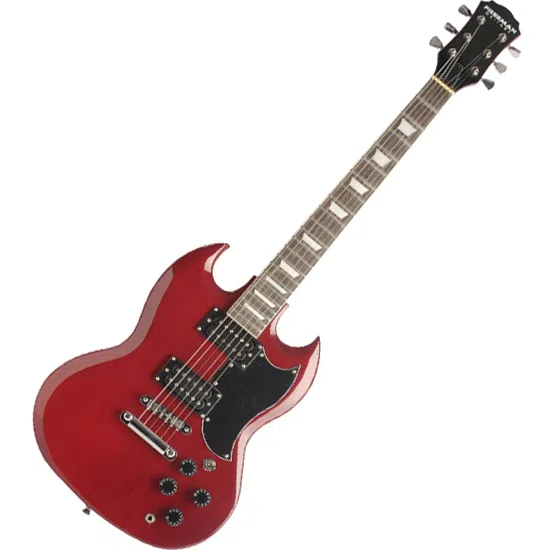 La FRE50 SG COLOR WR FREEMAN es una guitarra modelo SG de mango encolado color Wine Red (marrón), posee dos cápsulas humbuckers con controladores de volumen y tono individuales para cada una. Fabricada con cuerpo de caoba macizo, pickward central color negro opaco, puente fijo y clavijas tipo Gibson, es ideal para comenzar a dar tus primeros pasos en el mundo de la música.